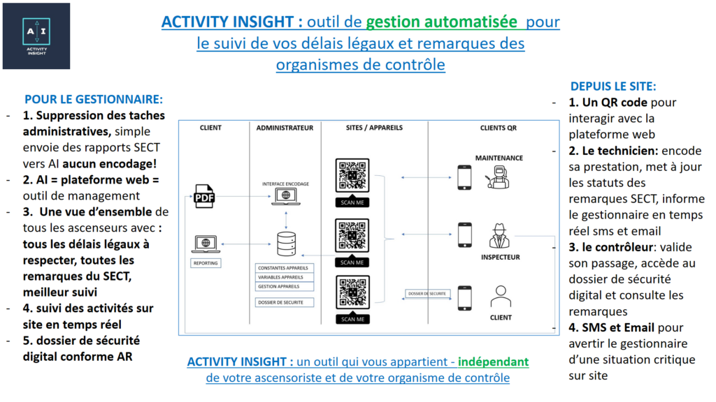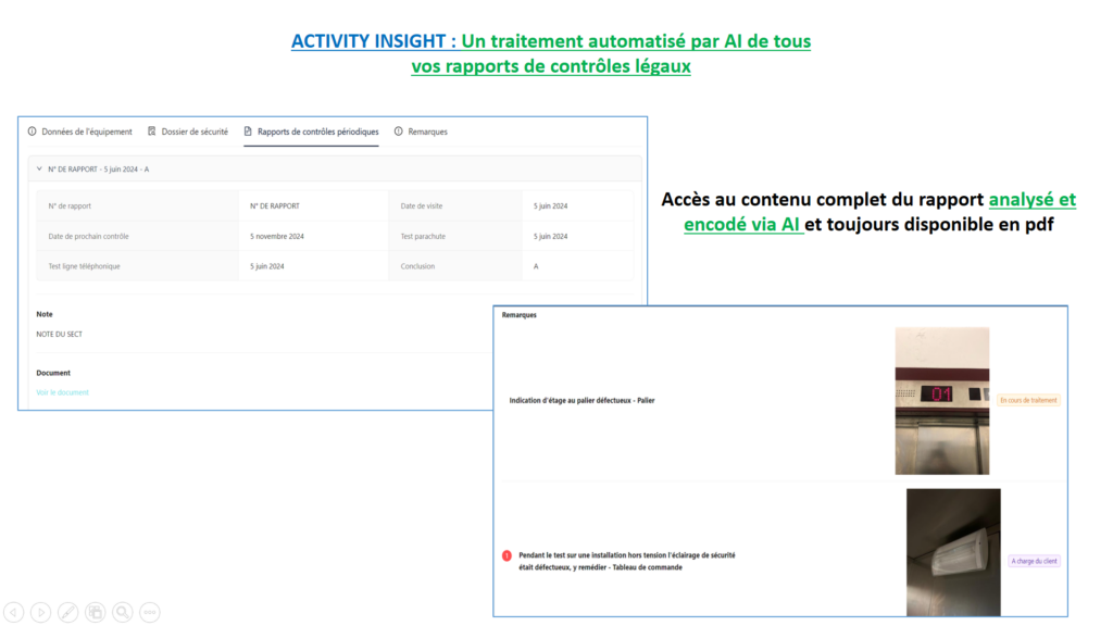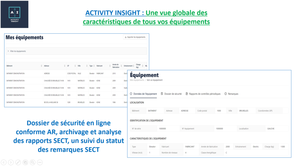 –Le premier accès : le client envoie le rapport de l’organisme de contrôle en format pdf vers l’administrateur de la plateforme. Le rapport est automatiquement encodé dans la base de données et les rapports disponibles dans la plateforme sont mis à jour : Mes équipements, Deadlines et Remarques. Pour chaque installation que compte le portefeuille du client la mise à jour de la plateforme est donc réalisée automatiquement au minimum 2 fois par an lors de l’entrée du nouveau rapport de contrôle dans Activity Insight.
